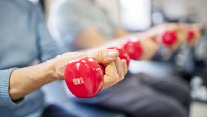 Lansia bisa menggunakan barbel ukuran 0,5 kg hingga 2 kg dengan melakukan gerakan sederhana seperti bicep curls (melipat lengan). Latihan ini membantu lansia agar tetap kuat mengangkat barang belanjaan bahkan menimang cucu.