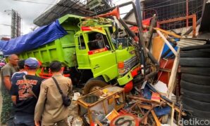 Truk Hilang Kendali Tabrak Warung Mi Ayam di Sukabumi