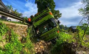 Truk Batubara Oleng dan Terjungkal ke Selokan di Sukabumi