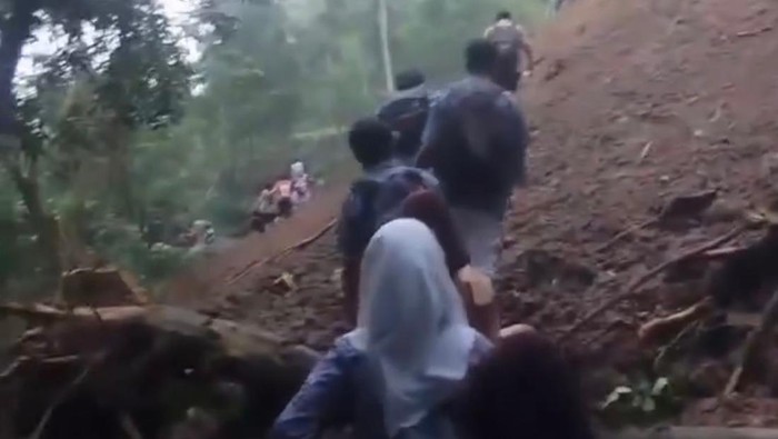 Peristiwa tersebut terekam dalam video yang viral di media sosial. Dalam video yang dilihat pada Jumat (6/2/2026), tampak sejumlah siswa berseragam pramuka dan batik berjalan perlahan menapaki longsoran tanah. Sebagian dari mereka melepas sepatu agar lebih mudah melangkah di tanah yang labil.