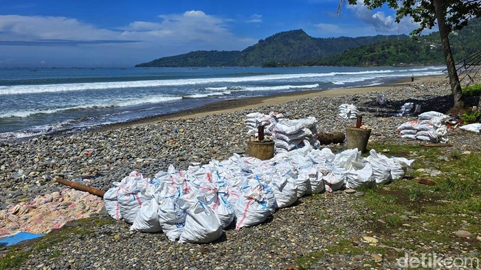 karung putih berisi koral di Pesisir Cisolok, Sukabumi.karung putih berisi koral di Pesisir Cisolok, Sukabumi. Foto: Syahdan Alamsyah