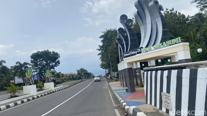 Trotoar di sekitarnya menampilkan warna-warni, berpadu dengan marka hitam-putih pembatas jalan, sementara lalu lintas kendaraan mengalir di bawah tulisan ‘Selamat Datang di Kota Sukabumi’. Pada malam hari, lampu hias mempertegas siluet tugu yang kini menjadi wajah baru perbatasan kota.