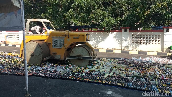 Sementara itu, alat berat dikerahkan untuk melindas puluhan ribu botol minuman keras dari berbagai merek. Suara raungan mesin bercampur dengan letupan kaca pecah memenuhi area pemusnahan.